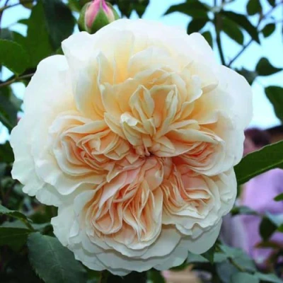 Цветок этой розы — воплощение нежности и сложности. Очень крупные, диаметром 8-10 сантиметров, густомахровые соцветия насчитывают от 100 до 110 лепестков, формируя пышную чашевидную или розетковидную форму. Их окраска совершает изящную эволюцию: персиково-розовые бутоны раскрываются в кремово-абрикосовые цветы, которые, полностью распустившись, становятся кремово-белыми с теплой кремово-желтой подкладкой лепестков. Эта игра пастельных тонов создает эффект внутреннего свечения и объема. Цветки располагаются поодиночке или в небольших кистях и обладают тонким, изысканным ароматом с пряными нотами гвоздики.