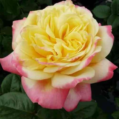 Цветок этой розы — настоящее зрелище, притягивающее взгляд контрастом и насыщенностью. Крупные, диаметром около 12 сантиметров, густомахровые соцветия насчитывают 50-60 лепестков и имеют пышную шаровидную или розетковидную форму. Их окраска представляет собой яркую двухцветную игру: основная масса лепестков окрашена в теплый желтый цвет, в то время как внешние лепестки обрамлены сочной, ярко-розовой или красной каймой. Эта эффектная комбинация раскрывается из округлых темно-малиновых бутонов. Цветки, расположенные поодиночке или в небольших кистях, наполняют пространство вокруг сильным, сложным ароматом с явными нотами ванили, гелиотропа и жасмина.