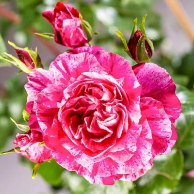 Цветок этой розы — настоящее произведение искусства. Крупные, диаметром 8-11 см, густомахровые бутоны, состоящие из 70-100 лепестков, раскрываются в квадратную или плоскочашевидную форму. Основная окраска плавает между красными и розовыми тонами, но главное очарование — это уникальные красно-фиолетовые лепестки, украшенные кремово-розовыми и сиреневыми полосками и штрихами. Яркие соцветия, собранные по 6-15 штук на стебле, источают сильный яблочный аромат с освежающими травянистыми нотами. Срезанные цветы отличаются исключительной стойкостью.