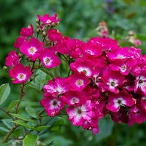 Цветки двухцветные, контрастной окраски. Светло-вишневый и белый цвета располагаются концентрическими кругами. Белая центральная часть цветка окружена светло-вишневым кольцом, образованным краями лепестков, отчего цветки выглядят эффектно. Они хорошо переносят влажную погоду, но на очень жарком солнце со временем лепестки некрасиво тускнеют. Чтобы кусты хорошо смотрелись, приходится срезать стареющие цветки. На кустах появляются сотни мелких светло-зеленых бутонов. Каждый распускается в широко раскрытый цветок диаметром не более 2,5 см, с 5 лепестками. Несмотря на обилие цветков, запах почти отсутствует. Крупные кистевидные соцветия обещают целое море цветков. Цветение продолжительное, обильное и в конце сезона. От основания куста отходит множество побегов. Кусты этого сорта характеризуются густыми кронами и достигают 1,2—1,8 м высоты при ширине 75 см— 1,1 м. В жарком климате при посадке следует избегать участков, где розы все время будут находиться на жарком солнце. Листья мелкие и многочисленные; матовые, цвет где-то между зеленым и светло-зеленым, далеко не самые привлекательные; хорошо выполняют свои функции, не прибавляя растению особой привлекательности, но делая крону густой и ровной. Насколько кусты выносливые, настолько и здоровые. Невосприимчивы к большинству заболеваний, но в конце сезона могут пострадать от мучнистой росы. Живые изгороди и смешанные бордюры - вот где пригодятся такие сильные растения. Сорт легко выращивать; цветение обильное и продолжительное.