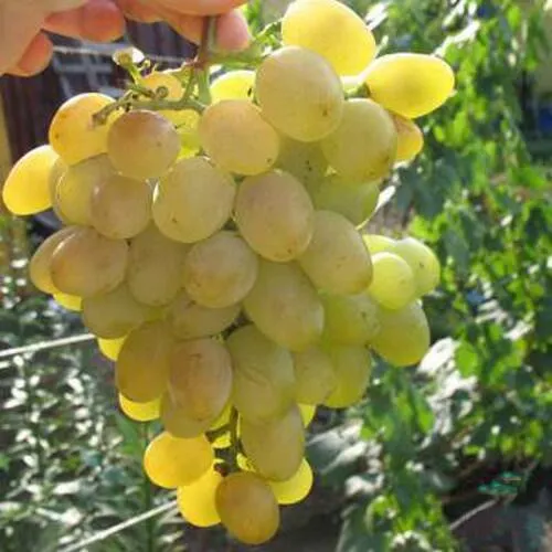 Кусты винограда Янтарь славятся обильной урожайностью, достигающей впечатляющих 120-140 центнеров с гектара. Средние и крупные грозди, весящие от 250 до 450 граммов, образуют классическую коническую или цилиндроконическую форму, варьируясь от рыхлых до достаточно плотных. Крупные ягоды, весом около 4-4,71 грамма, притягивают внимание не только цветом, но и своей особенностью формы: обратно-яйцевидные с пересечённой верхушкой, они покрыты мельчайшими коричневыми точечками, придающими неповторимость их внешнему виду. Мясисто-сочная консистенция мякоти и сильный мускатный аромат — это то, что заставит вас по достоинству оценить этот сорт.